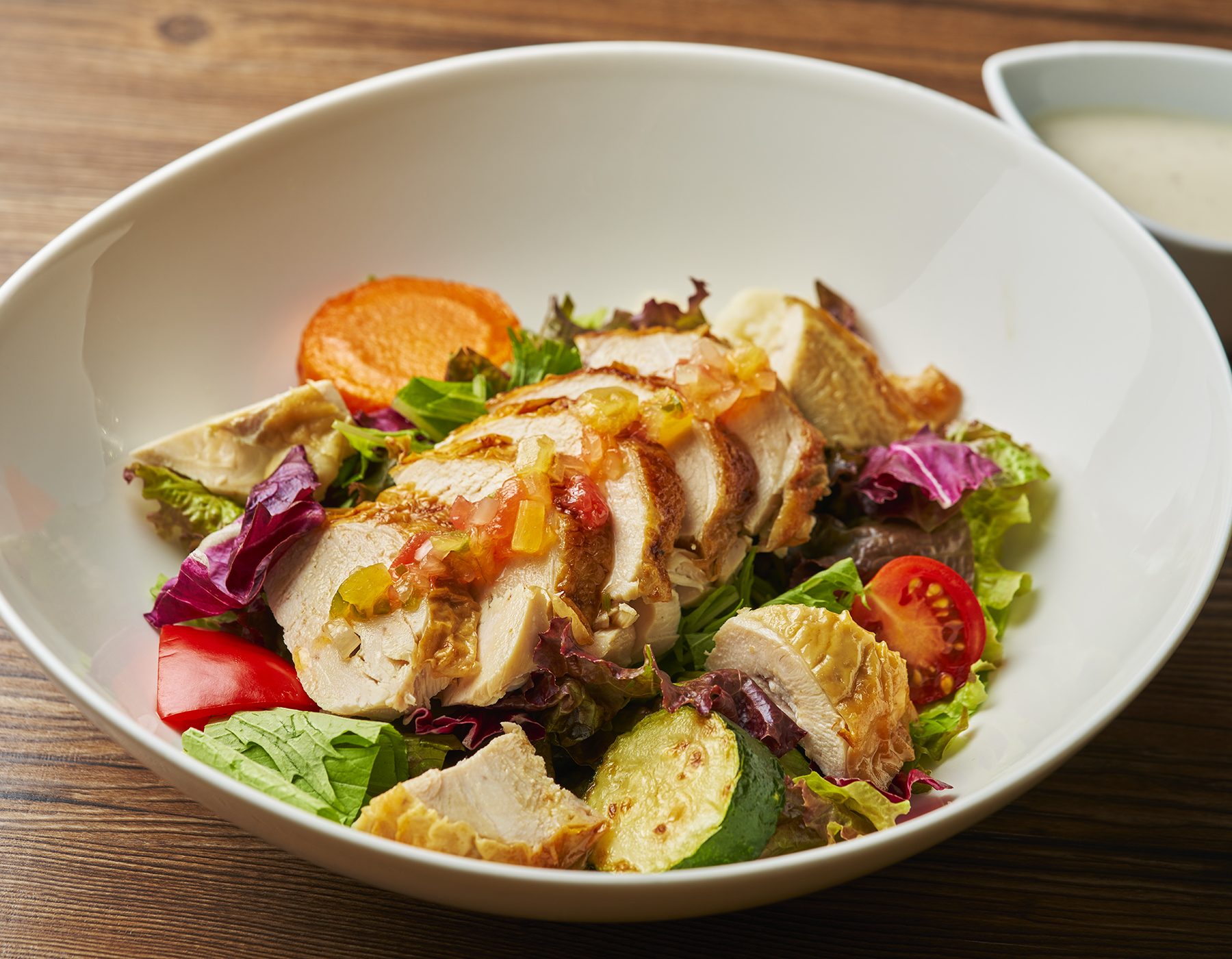 5種類のハーブと野菜に長時間漬け込み、専用のロティサリーグリルで丁寧にじっくりと焼き上げるロティサリーチキンをはじめ、シェフのこだわりが詰まった料理やパティシエのアイディア溢れる季節のスイーツなど、バラエティ豊かなメニューをお楽しみください。