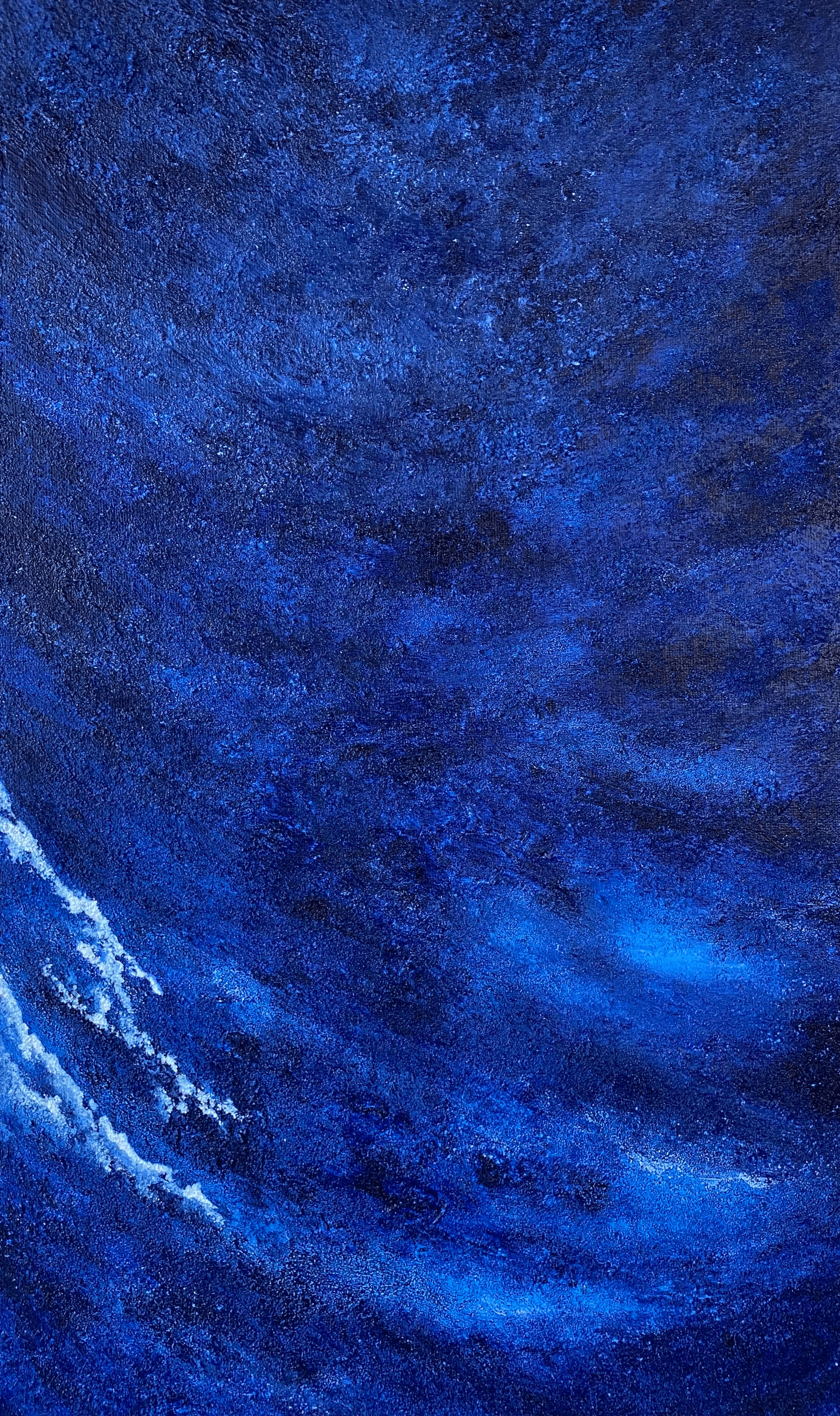 砂が刻む質感と、流麗な筆跡。それは、遠い記憶の底に沈んでいた「海」の断片である。私が描くのは、単なる風景ではなく、かつて誰かが聞いた人魚の歌声や、深海に眠る宝石のような色彩、そして過ぎ去った時間の残響。光の移ろいとともに変化する絵肌は、止まっていた過去の情景が、今という時間と共鳴し、再び呼吸を始める瞬間を映し出している。