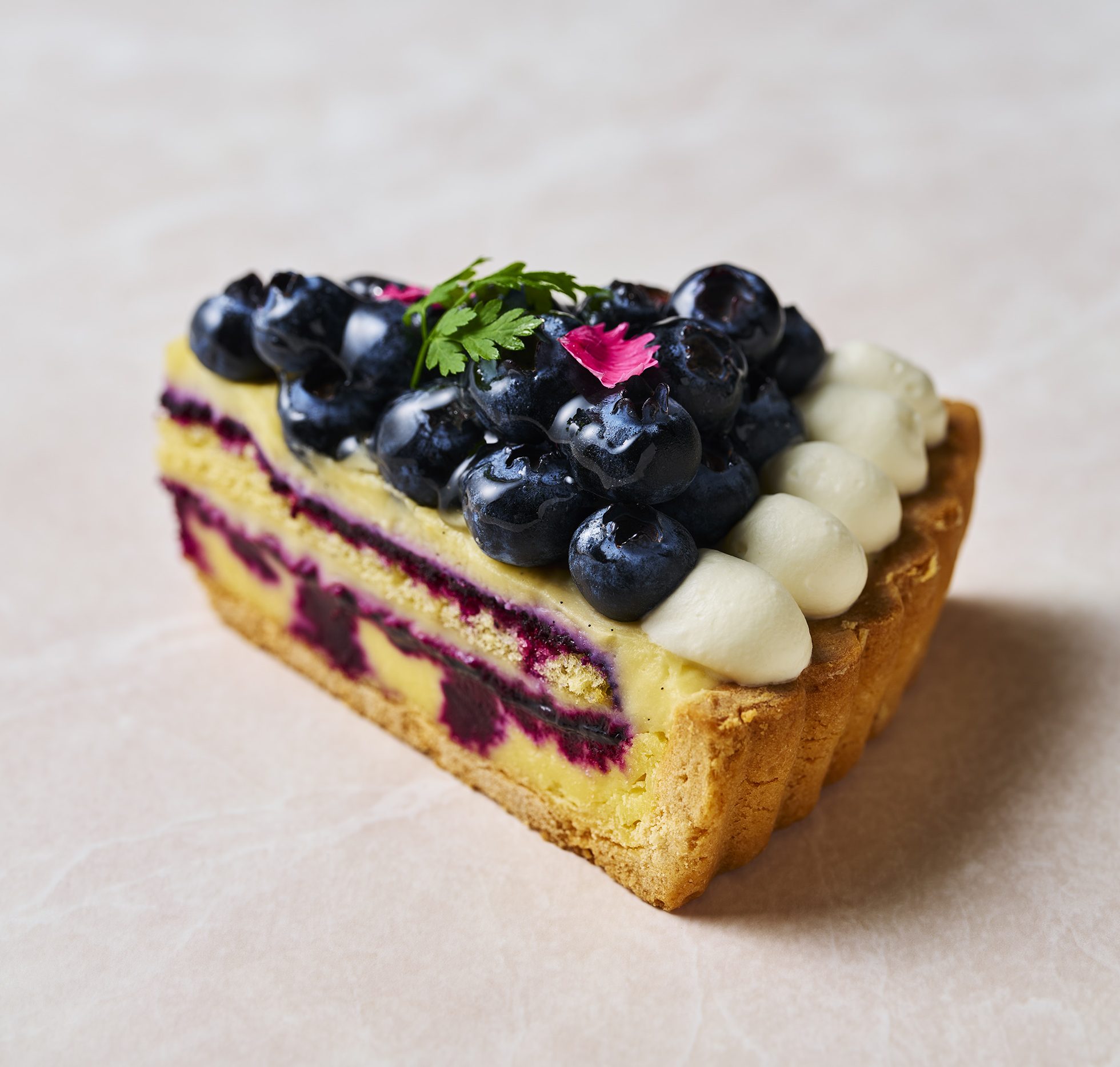 ベイクドチーズケーキを土台に、ジェノワーズとブルーベリージャム、ソースを重ね、ディプロマットクリームとブルーベリーを添えました。